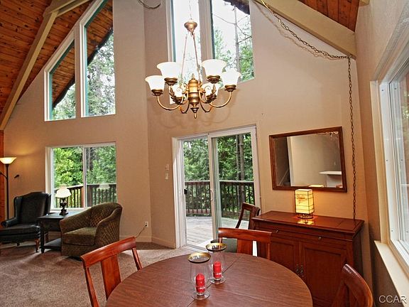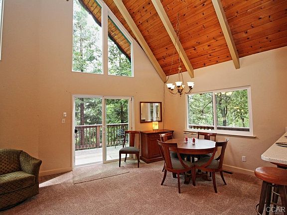 Looking for privacy and the feeling that you're nestled in the trees? This 3 story mountain chalet may be just what you're looking for. The home is situated on two parcels that total .79 acres of privacy. Vaulted beamed ceiling with a wall of windows lending to the scenic view and natural sun light. Open great room with breakfast bar, wood stove, FAG, dining area and easy access to the spacious wrap around deck. Two bedrooms, full bath and laundry on the main level. Spacious loft with a half bath and plenty of room for sleeping and gaming. A bonus room or master suite with full bath on the lower level. This home is ready for your enjoyment including new windows, newer flooring, newer decking, newer septic and most furnishing included. Don't miss this opportunity!