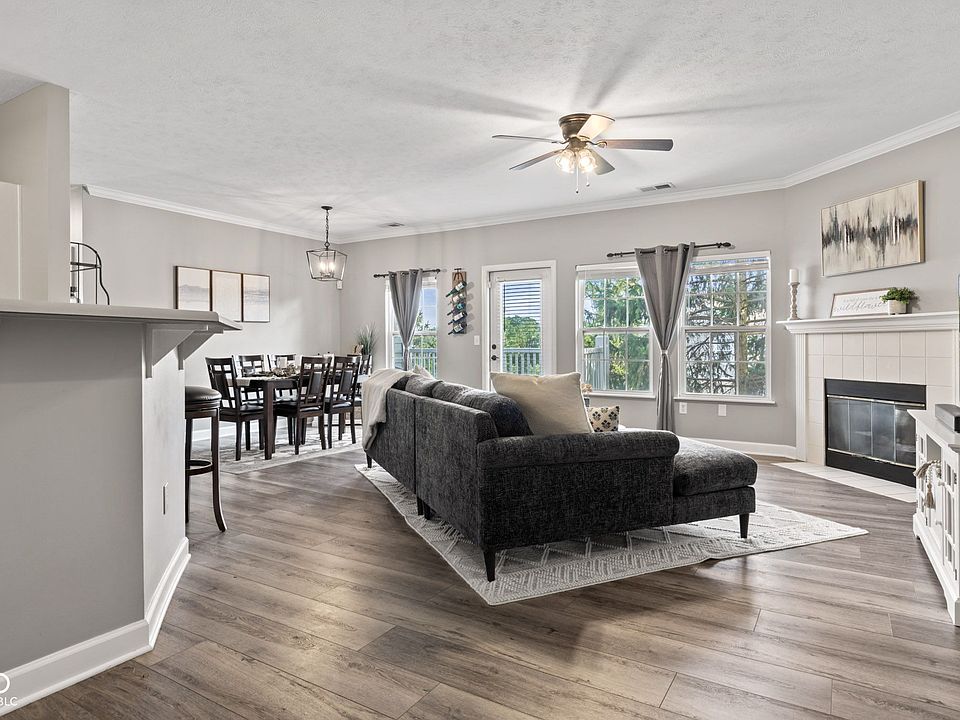 Nestled at 1447 Shadow Ridge Rd, Carmel, IN, this beautifully maintained 2-bedroom, 2-bath condominium combines comfort and convenience in a welcoming community. Step inside to 1,535 square feet of thoughtfully designed living space, highlighted by 9-foot ceilings and abundant natural light. The spacious great room offers a cozy gas fireplace, creating the perfect centerpiece for relaxing evenings or entertaining guests. The kitchen is fully equipped with SS appliances and a convenient breakfast bar. A large pantry and ample cabinet and counter space make meal prep a breeze. Both bedrooms are generously sized with walk-in closets, including a primary suite featuring a garden tub and full bath retreat. Additional highlights include fresh paint, crown molding, updated lighting, and new LVP flooring throughout. Practical features enhance daily living: a laundry room on the main level with washer and dryer included, an oversized one-car garage with epoxy flooring, and relaxing patio with beautiful lake view. Lean into condo living at the pickleball courts, luxurious pool, sauna (after the gym), or hit the Monon trail (direct neighborhood access)! Built in 2001, with many recent updates, this one-level condo offers a balance of space, style, and low-maintenance living - a great value in an excellent Carmel location.