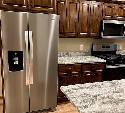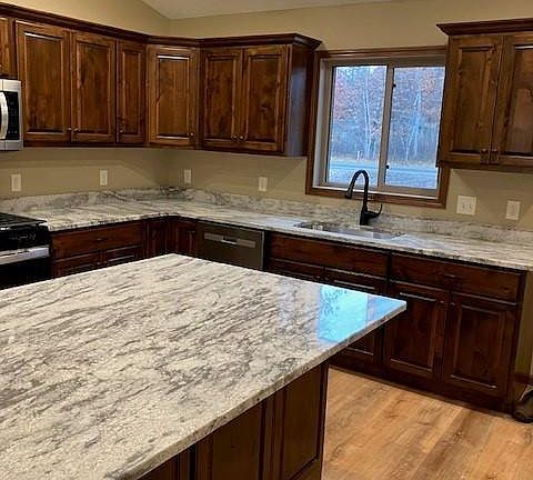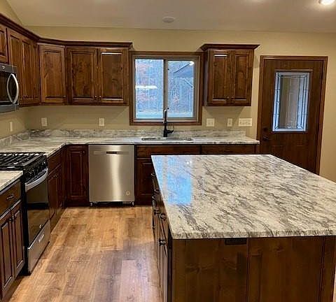 The kitchen has stainless appliances, granite countertops, custom cabinets and a walk in pantry. There are vaulted ceilings in the connected kitchen, living, and dining area. City sewer, city water and on demand hot water.