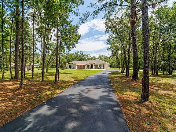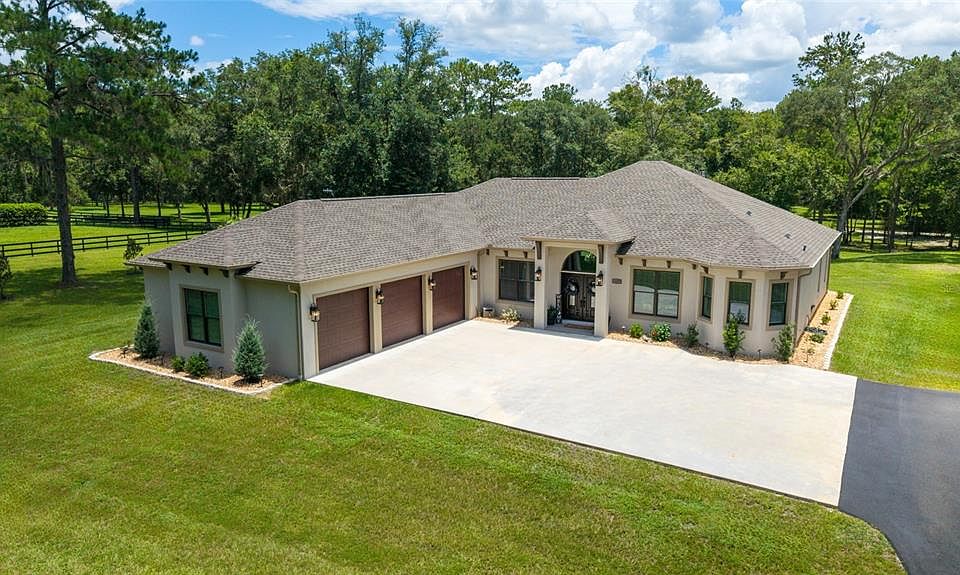 Welcome to this beautifully designed 2022 custom home, nestled on 7.33 private acres in The Village at Hidden Lakes, a gated equestrian community where deer and turkey often wander through the yard and peaceful mornings start with nature right outside your window. This is one of the largest lots in the neighborhood, offering the perfect combination of tranquility, privacy, and potential for your dream farm or country retreat. As you arrive, an automatic iron gate opens to a winding asphalt driveway, leading you beneath scattered oaks and past lush, green grass to the front entrance. The home is thoughtfully set back on the property, framed by mature trees and beautifully landscaped with river stone accents. Whether you plan to bring horses or simply want room to breathe, this property delivers the lifestyle you’ve been dreaming of. Step inside and you’ll immediately appreciate the open, inviting floor plan designed for both comfortable living and effortless entertaining. With 2,597 square feet of living space, this home feels bright and airy, thanks to expansive Pella windows that fill the home with natural light. The living room features wood-look tile throughout, and a stunning floor-to-ceiling stacked stone gas fireplace with a remote thermostat, elevated hearth, and custom mantle—perfect for cozy evenings at home. The main living space also includes a dedicated area for your dining room table, allowing for seamless gatherings and family meals. The chef’s kitchen is a standout, complete with soft-close custom cabinetry, granite countertops, a gas cooktop, stainless steel appliances, and a coffee station with extra cabinetry and counter space. An oversized kitchen bar is perfect for casual breakfasts, while a separate dining nook overlooks the backyard, creating the perfect spot for morning coffee with a view. A private office with French doors is located just inside the home near the main living area, offering a quiet space to work from home without sacrificing convenience or flow. The split floor plan provides privacy for family and guests. The master suite is tucked away on one side of the home, featuring double closets and a spa-style bath with dual vanities, a deep modern soaking tub, and a walk-in tiled shower. On the opposite side, two guest bedrooms share a beautifully finished bath. An additional half bath and a well-appointed laundry room with cabinet and counter space are conveniently located near the 1,006 sq ft 3-car insulated garage, complete with insulated doors for comfort and efficiency. All interior doors are 36” wide, making the home handicap accessible, and 10’ ceilings with 11’ tray accents add a sense of space and light throughout. French doors lead from the living room to the covered back porch, where you’ll find a ceiling fan and TV hookup—the perfect place to unwind in the evenings while watching the local wildlife. From here, step into the expansive backyard where you can easily add barns or pastures to create your own horse farm, or simply enjoy the serene, park-like setting with scattered oaks and lush grass. A storage shed is included for yard equipment, and a list of select furniture is available for purchase with the home. Conveniently located just 20 miles to I-75, 19 miles to the World Equestrian Center, 9 miles to HITS, 7 miles to Williston, 26 miles to Gainesville, and 20 miles to Ocala, this is the perfect blend of luxury living, rural charm, and modern comfort.