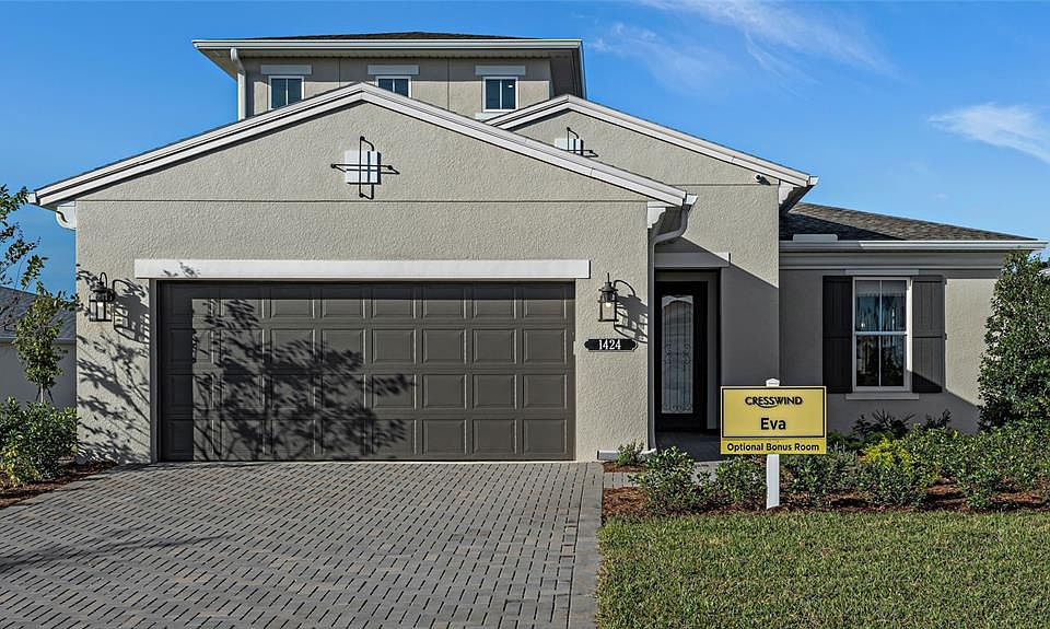 Pre-Construction. To be built. Residents of Cresswind at Lake Harris enjoy exclusive amenities, including 8 championship pickleball courts, a grand clubhouse with state-of-the-art fitness center, a resort-style swimming pool with lakefront views, and marina access to the pristine Lake Harris. Nestled on a peninsula in between Lake Harrs and Lake Dora, this location puts you right in the center of the Chain Of Lakes area and all it has to offer. Experience privacy, security, and an active lifestyle in a highly desirable location. Club Cresswind will overlook the lake and feature a wide range of indoor and outdoor amenities such as Cresswind SmartFIT Training Center powered by EGYM. Experience the Eva floorplan—a beautifully crafted 2-bedroom, 2-bath home with flex room that can be a study, game room, or even a third bedroom. This thoughtfully designed residence showcases an expansive open-concept Great Room, filled with an abundance of natural light that creates an inviting and airy atmosphere for both relaxing and entertaining. The chef-inspired kitchen is equipped with stunning granite countertops, elegant cabinetry, and modern finishes, offering both style and functionality for culinary enthusiasts. Step outside to the spacious covered lanai, perfect for enjoying Florida’s renowned indoor-outdoor lifestyle, hosting memorable gatherings, or simply unwinding in your private retreat. The secluded Owner’s Suite provides a true sanctuary, featuring a generous vanity area, a luxurious frameless glass shower, and an oversized walk-in closet for exceptional storage and organization. Additional highlights include a roomy 2-car garage and a layout that maximizes both convenience and elegance. With premium finishes and a prime location, the Eva floorplan delivers unparalleled comfort, sophistication, and everyday practicality—making it an exceptional choice for discerning homeowners seeking a harmonious blend of modern luxury and refined living.