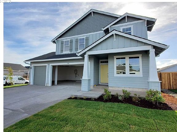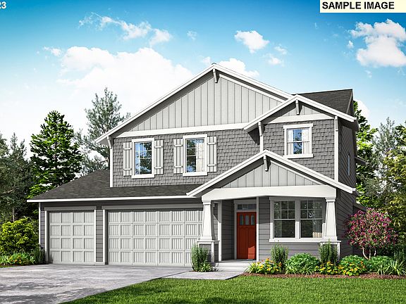 June 2023 completion. This two-story home has a classic layout for growing families. The front door leads to an open foyer with a bedroom attached. Down the hall is the open living area that includes a modern kitchen, Great Room and dining area with slider to the patio. Upstairs are three bedrooms including the owner's suite, split design for privacy for all, plus a versatile bonus room. Exterior and interior photos of similar home.