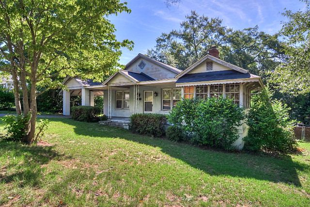 2BR-1.5BA cottage with 1950s charm is ready for new owners. Just a few updates will really make it shine! Location is very convenient for students at Augusta University and medical professionals. Close proximity to Downtown, Augusta Mall, Trinity Hospital, and Pendleton King Park. Covered front porch and attached carport. Formal living room with crown molding and brick fireplace. Sunroom off living room is a relaxing, cheerful spot and has a door to the front porch. Arched doorway of living room leads to open dining room with crown and chair rail molding. Kitchen has tile backsplash, ample counter and cabinet space, and appliances to remain. Two bedrooms have easy access to full bath with tile floors and a tub/shower combo. Half bath and spacious laundry are convenient to the kitchen and side entrance. Enjoy the fenced back yard under the shade of gorgeous old oak trees. Some cosmetic updates would provide the face-lift that this adorable cottage needs!