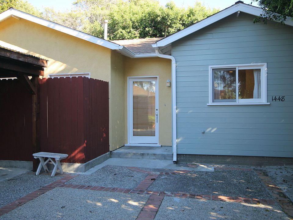 A long driveway leads you to a very private back house Completely separate and private. Light and Bright Great area walk/bike to all! Lots of private outdoor space Open floor plan with the newly updated kitchen--beautiful white cabinets Real wood floors Home has fresh paint and ready to move in. Two spacious bedrooms--each bedroom has french doors that lead to private outdoor patios. The property has gorgeous lush landscaping. This amazing house offers: **Unsurpassed central location--walk/bike to all **Gleaming wood floors **Recessed lightly throughout **Refrigerator, gas stove, and dishwasher **Washer dryer included **Beautiful natural light--newer energy-efficient windows **Gardener included **Private quaint yard and patio Shown by appointment only We are an Equal Housing Provider and follow all Fair Housing Laws BRE #00876465