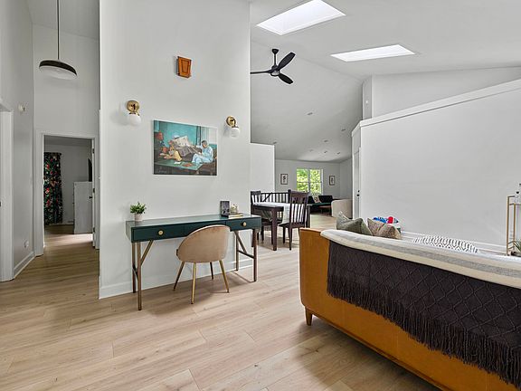 Highlighted by great natural lighting and window views of the woods, the entire social space is inviting and warm. Speaking of which, the Hearth Room beckons to all with its vaulted ceilings, lovely fireplace, and stylish furnishings, with all sorts of comfy seating options plus a Smart flat-screen TV with Apple TV. And since we're talking about entertainment, there's also a record player and popular albums available for all to enjoy, along with a Bluetooth sound system.