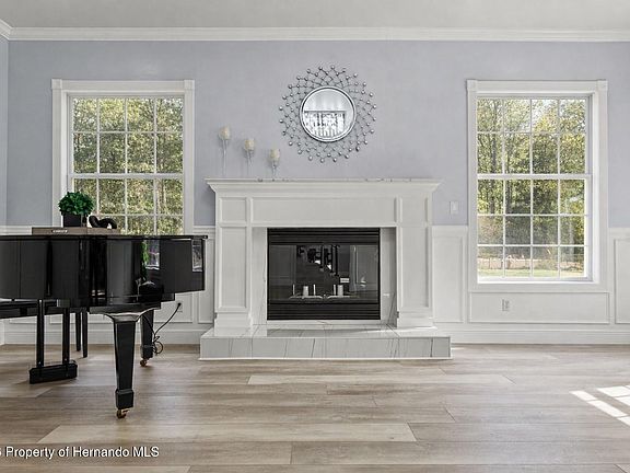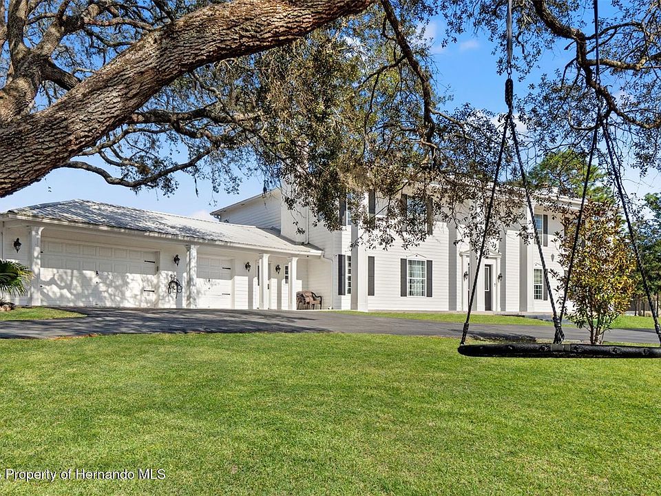 Inspired by classic Colonial architecture and the grandeur of the White House, this extraordinary estate offers refined living on a private 2.40-acre setting with no HOA, no CDD, and AR2 Agricultural Residential zoning—giving you space, freedom, and flexibility. With 4 bedrooms, a private office, 3 full baths, 2 half baths, and 4,240 square feet of living space (6,334 total square feet including the garage), every detail has been thoughtfully designed for both elegance and comfort.From the moment you arrive, the home makes a statement. A gated, fully enclosed property opens to a stately residence where a dramatic two-story foyer welcomes you inside. A breathtaking chandelier cascades light over a custom quartz staircase with modern cable railing, setting the tone for a home that blends timeless design with contemporary sophistication. Formal sitting and dining rooms frame the entry, ideal for entertaining or quiet moments alike.At the heart of the home is a chef's kitchen that is nothing short of exceptional. Designed for both function and beauty, it features premium Dacor appliances, including double ovens, a 48-inch dual-fuel steam range with griddle and six-burner gas cooktop, double-column refrigeration, built-in freezer drawers, a Dacor dishwasher, and a Miele espresso maker. A generous quartz island anchors the space, complemented by a walk-in pantry, butler's pantry, built-in ice maker, and a charming eat-in nook overlooking the pool through a sunlit bay window.The living spaces are equally inviting, with luxury vinyl flooring, custom finishes, and three wood-burning fireplaces that add warmth and character throughout. A custom home theater living room elevates entertainment, featuring professionally installed KEF surround sound, in-wall and in-ceiling speakers, a subwoofer, and Denon receiver—all seamlessly controlled by a Savant remote. (Projector and screen available separately.)Upstairs, four spacious bedrooms provide comfort and privacy. Two guest suites offer en-suite bathrooms and custom closets, while the primary suite is a true retreat. This serene space includes a private balcony overlooking the pool, a spa-inspired bath with dual vanities, rainfall shower, and garden tub, plus an expansive custom closet complete with center island and a secure armory room.Security and peace of mind are paramount, with a motorized main gate, service gate, ADT security system, full camera coverage, and a dedicated safe room with surveillance monitors.Modern conveniences abound, including two new 5-ton Trane AC units, a tankless water heater, Generac generator with 350-gallon propane tank, water softener, new well pump and tank (2024), EV or camper 30-amp hookup, oversized laundry room, and a pristine epoxy-floored garage with craftsman workbench.Step outside to your own resort-style oasis. A heated Pentair pool with waterfall is surrounded by refinished pavers, while a gazebo invites evening gatherings and a greenhouse offers year-round gardening. Every element of this estate has been curated to offer luxury, privacy, and a lifestyle that feels both grand and effortlessly livable.