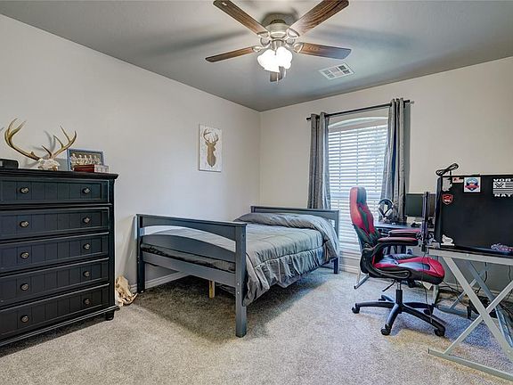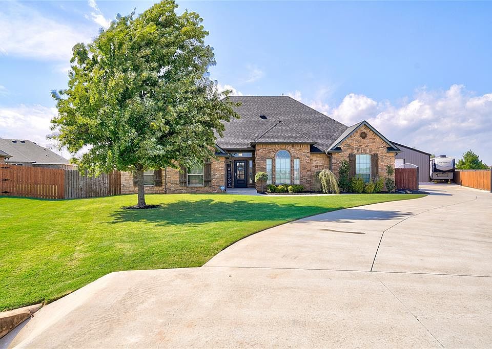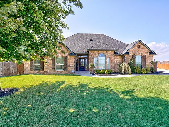 Elegant 4-bedroom, 2.5 bath home at end of cul-de-sac with no through-traffic. Great schools. Close to Mustang, Yukon, Blanchard and Newcastle/Tri-City restaurants and shopping centers. Many must-see features! Home offers split bedroom floor plan for privacy (huge 4th bedroom-could be a home office) and long hall with beautiful built-in cabinetry. Living room and eat-in kitchen area feature high-end designer cellular shade window treatments with light-filtering and total blackout options. Custom black granite fireplace with carved mantel in living room. Kitchen, halls, and bathrooms have durable wood-plank tile flooring and designer hardware throughout. Formal dining room includes large picture window. Kitchen has black granite countertops and upgraded, large gas range/microwave with separate coffee nook. Expansive laundry room w/tons of storage and deep sink.