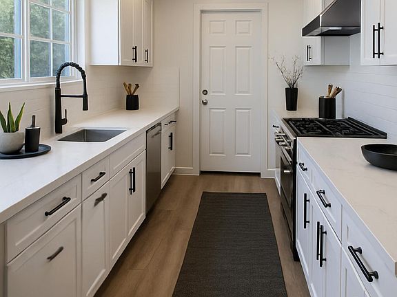 The kitchen is dreamy, with refinished white cabinetry, sparkling granite, marble-look counters, stainless steel appliances (yes, even the hood!), subway tile backsplash, a brand-new sink, faucet, and garbage disposal. It's the kind of kitchen that actually makes you want to cook!