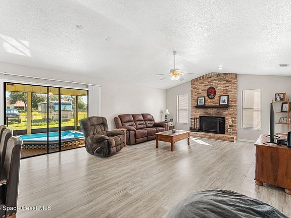 Welcome to your next home—clean, refreshed, and move-in ready! This 3-bedroom, 2-bath home features new flooring, fresh interior and exterior paint, and a bright, open layout centered around a wood-burning fireplace. Step outside to a screened patio with an in-ground hot tub and a fully fenced backyard. With an easement right behind the home, you'll love the peace and privacy of no direct rear neighbors. Additional highlights include a 2020 roof, indoor laundry, a storage shed, side gate for boat or RV parking, and a two-car garage—all in a quiet, established neighborhood close to shopping, dining, and I-95.
