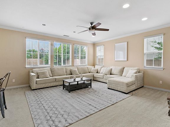 This 5 bedroom and 4.5 bathroom home showcases a formal living room with high ceilings and a formal dining area along with a downstairs bedroom suite with its own bathroom as well as a guest bathroom. The upgraded kitchen with stainless steel appliances, dual ovens, 5-range gas cooktop, and oversized island with granite countertops is a chef's delight. A butlers pantry with built-in wine rack and granite counters sits across the spacious pantry. The in-kitchen dining area includes a custom tech-center with access to the backyard. In the upstairs, you will find an open loft area overlooking the formal living room with balcony access. Along with additional bedrooms and baths. Take a peek at the large master suite with separate his and hers walk-in closets with custom-built shelving. An upgraded master bath with tiled countertops, upgraded shower and jetted tub and vanity area. You will also find an upstairs laundry room with built-in cabinets. This home has stunning crown molding throughout with lots of other upgraded features. The backyard area is ideal for entertaining and family gatherings. The oversized 4-car tandem garage is attached to the house.