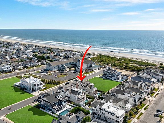 Experience Stone Harbor living at its finest in this custom coastal estate, ideally positioned on an oversized 63' x 110' lot at one of the island’s highest elevation points. Located beach block on the coveted 112th Street—known for its underground utilities, privacy, and exclusivity—this home offers ocean views and a serene setting just steps from the sand. A stately bluestone entryway with just one step up from ground level welcomes you home—an exceptionally rare feature that highlights the rare high elevation of this lot and provides ease of access without sacrificing curb appeal or privacy. Offering over 3,400 square feet of refined interior living space and more than 2,000 square feet of outdoor living across four spacious decks, this home was thoughtfully designed for seamless indoor-outdoor living. Ocean views are visible from multiple vantage points, including covered porches, a grilling deck, and a rooftop deck with sweeping panoramic views. The floor plan includes six en suite bedrooms and two additional powder rooms, comfortably accommodating family and guests. The first level features four suites—including a custom bunk room—and a spacious family room that opens directly to the backyard retreat. The unique elevation allows are rare opportunity to have your family room level with sandblasted marble patio surrounding the pool. Outside, a 12' x 25' heated pool with integrated spa and swim-up bench anchors the private outdoor space, complete with a cabana featuring a wet bar and built-in storage, plus a covered lounge with a gas brick fireplace for year-round enjoyment. Upstairs, a dramatic two-story great room with soaring 16' ceilings, tongue-and-groove woodwork, and a stone-trimmed gas fireplace makes a lasting impression. The adjacent chef’s kitchen is equipped with Sub-Zero, Wolf and Bosch appliances, custom cabinetry, a generous island for entertaining and a walk-in pantry. The dining area opens to a large ocean-view porch, perfect for enjoying ocean breezes and evening sunsets. The second-floor primary suite serves as a true sanctuary, offering a spa-inspired bath with walk-in shower, double vanities, and a private deck with ocean views. A junior suite and second powder room complete the upper level. The garage provides abundant storage for beach gear, bikes, and equipment. The home’s exterior showcases Maibec cedar shake siding, Alaskan cedar roof with metal accents, mahogany decking, and low-maintenance Intex railings—selected for both beauty and durability. Additional features include designer-curated furnishings (sold fully furnished and move-in ready), elevator, whole-house audio system, HD CCTV security, professional landscaping with irrigation, and exterior lighting controls. Set among other newly constructed luxury homes, 112th Street is one of Stone Harbor’s most exclusive and visually pristine beach blocks, free of overhead utility lines and visual clutter. This residence is more than just a home—it's a coastal sanctuary where architecture, design, and location converge to offer a one-of-a-kind legacy retreat at the Jersey Shore.