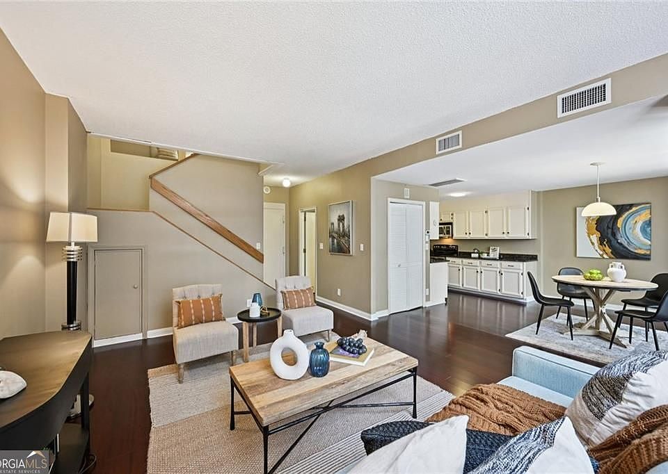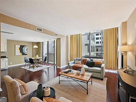 Dramatic 2-Story Condo in Colony Square, the Heart of Midtown! Discover the epitome of urban living in this stunning 1,500 Sq Ft condo located in vibrant Colony House. This residence boasts 2-story windows that offer a breathtaking view of the beautiful garden patio of Saints + Council and the exciting city-scape of Midtown. The open floor plan downstairs features hardwood floors and offers ample space for entertaining. The living room seamlessly flows into the dining area, which then opens up to great kitchen for all your culinary needs. A convenient powder room for guests is also available downstairs, along with extra storage space under the stairwell. The washer and dryer are placed in a closet next to the kitchen for easy access. Upstairs, you will find two large, carpeted bedrooms and two bathrooms. The master bathroom has been updated with tiles, a new walk-in shower, and a spacious walk-in closet. Additionally, the loft on the second floor presents a versatile space that can serve as an office or accommodate a Murphy bed. This unit could be sold fully furnished. The Colony House Condo is pet-friendly and is surrounded by numerous parks, making it an ideal choice for pet owners. YES, it is FHA approved. Living in Colony Square means enjoying the best of the urban "live-work-play" lifestyle. With a fantastic selection of restaurants and a food court right at your doorstep, you'll find little need to cook. MARTA is just one block away, providing quick access to the airport. Additionally, you are within walking distance of Piedmont Park, the Beltline, Botanical Gardens, Alliance Theater, Museum, Symphony, Whole Foods, and yoga classes. Embrace the luxurious urban living experience that Colony Square has to offer. This condo is not just a home, but a gateway to a vibrant, dynamic lifestyle.