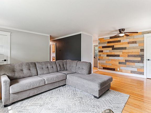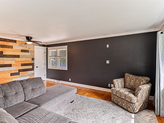 Inside, enjoy real hardwood floors, crown molding, and abundant natural light from the oversized front window. The spacious dining area features an accent wall, pantry closet, and ceiling fan, while the updated kitchen boasts newer cabinetry and countertops, sleek black hardware, stainless steel stove and microwave, and convenient access to the backyard deck. Three generously sized main-floor bedrooms all offer great closet space and ceiling fans. The lower level is ready for new carpet and features a large family room, two bonus rec rooms, a 4th bedroom, full bath, laundry, and ample storage. Outside, you’ll find a fully fenced yard perfect for pets or play, an oversized 2-car garage, a cozy firepit area for evening gatherings, and a spacious deck ideal for relaxing or entertaining. Nestled on a quiet street with a welcoming feel, this home offers the perfect blend of comfort, care, and charm — a place you’ll love coming home to.