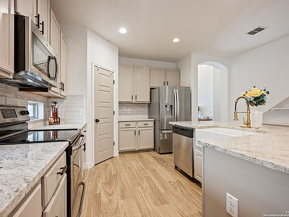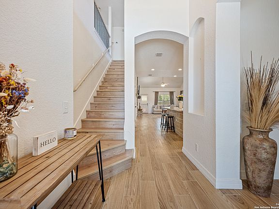 This beautifully upgraded two-story home, ideally located within walking distance of historic downtown Boerne, offers exceptional value with approximately $50,000 in recent custom upgrades. This popular Armadillo Homes floor plan boasts luxurious, low-maintenance living starting with wood-look tile flooring that flows throughout the entire home. The chef's kitchen is a true delight, featuring granite countertops, a massive island, a farmhouse sink, and modernized style with freshly painted cabinets and an upgraded gold kitchen sink faucet. The open living room is enhanced by a cozy fireplace and custom-added built-in shelves and cabinets. The spacious primary suite is conveniently located downstairs with a luxurious bath featuring dual sinks, a garden tub, a separate shower with upgraded tile, and ample closet space. Upstairs offers a versatile loft and three generous bedrooms, all of which, along with the living room, have been upgraded with new ceiling fans. Additional value includes the refrigerator and owned water softener which will convey. Outdoor amenities include a covered patio, storage shed, and an outdoor firepit, all within The Woods of Frederick Creek, providing quick access to shopping and entertainment. This meticulously maintained home truly shows pride of ownership and is move-in ready.