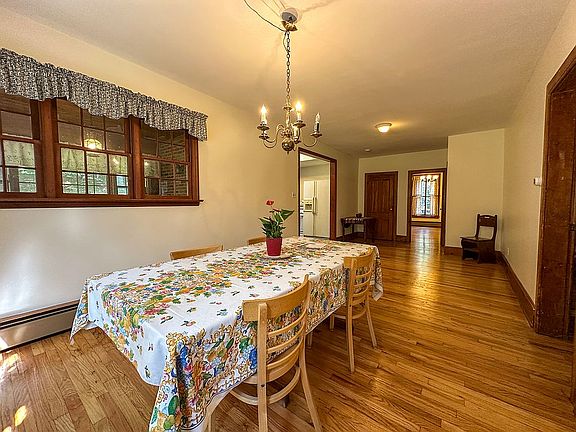 Inside, the home boasts classic hardwood flooring, oversized windows that flood the interior with natural light, and original architectural details that reflect its historic character. The spacious layout includes multiple large rooms ideal for relaxing or entertaining, and a charming brick fireplace adds a cozy touch.