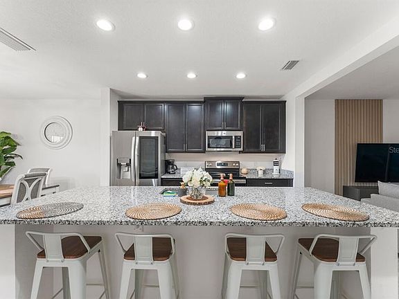 Beautiful Fully Furnished 3 Bedroom / 2.5 Bathroom Townhome in a Desirable Gated Community! This move-in ready for August two-story unit is being rent completely furnished, featuring tasteful and modern furniture throughout. The open-concept kitchen offers quartz countertops, extended cabinets, and plenty of storage space. The first floor includes custom blinds and lighter tile flooring. All bedrooms are upstairs with carpet and spacious closets. The master bedroom includes an ensuite bathroom with a stand-up shower. Washer and dryer are included. Enjoy the open lanai with no rear neighbors, perfect for relaxing and enjoying Florida's weather. The community offers excellent amenities, including a pool, playground, and clubhouse. Prime location with quick access to Hwy 27, I-4, US 192, US 17, 429, Champions Gate, and Solterra. Just 20 minutes from Disney parks and close to top-rated schools, shopping, dining, golfing, and entertainment. Renter's insurance required. No pets allowed. It could be rented full furnished with an extra month amount.