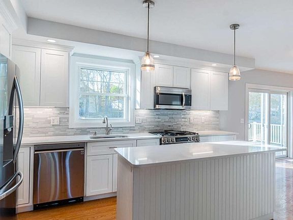 Welcome home! First floor features an open floor plan with living room, dining room, home office and a custom kitchen with quartz countertops, custom cabinets and stainless appliances including a wine cooler. Second floor has the primary suite with a spacious walk in closet and private bathroom, three additional bedrooms, second floor laundry room and walk up third floor. Bathrooms have quartz countertops and beautiful tiled floors. Enjoy the beautiful new deck overlooking the oversized back yard. Property also boasts a finished basement, potential to finish the attic space into extra living space, and hardwood floors throughout. Conveniently accessible to Rts 1, 128, 95 & Legacy Place. Don't miss this unique opportunity to reside in a spectacular suburban home with a prime location!