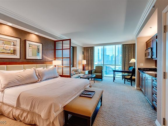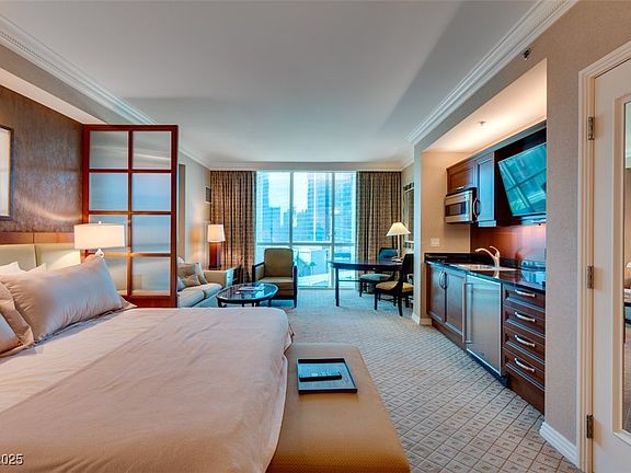 Beautiful studio on the 5th floor WITH STRIP VIEWS! Guard Gated MGM Signature! ACCESS TO MGM Grand Fully Furnished, MEDIA CENTER, TV, MARBLE CLAD BATHS & JETTED TUB, KING SIZE BED, SOFA SLEEPER, KITCHENETTE with microwave, cook-top, and refrigerator! Enjoy 3 Resort Style Pools, Lounge & Starbucks,2 Fitness Centers, Cafe, Laundry facilities.