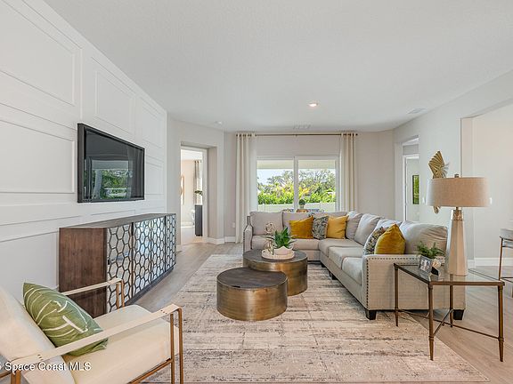 Introducing the Redbud at Riverwalk of Cocoa - a beautifully designed 1-story home with 2,312 sq. ft., 4 bedrooms, 3 bathrooms, and a 3-car garage. Its stunning curb appeal includes a paver driveway, lush landscaping, and an irrigated lawn. Inside, RevWood vinyl plank flooring in main living and wet areas and Mohawk® carpet create a welcoming feel. The chef-inspired kitchen features 42'' cabinets, quartz countertops, and KitchenAid® appliances. The spacious primary suite offers dual sinks, a separate shower, and a walk-in closet. Built with energy-efficient features and smart home technology.