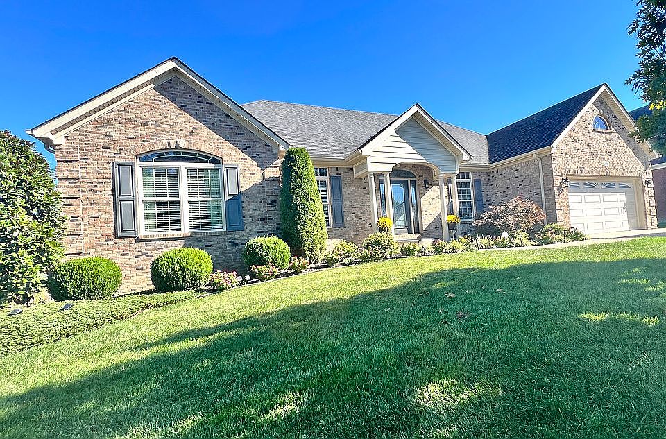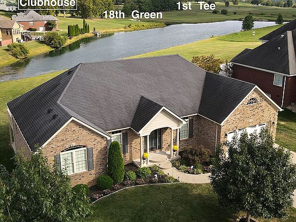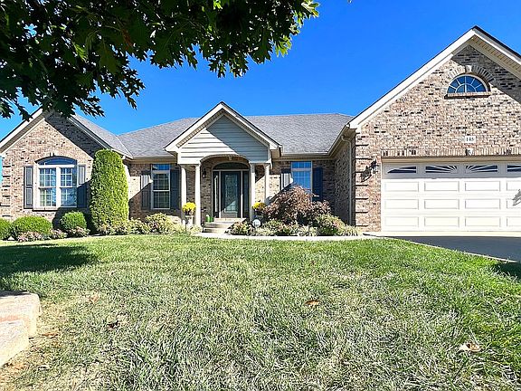 In this charming home, relaxing is easy, as you enjoy the recently painted and huge deck, while gazing across the lake toward the 18th green of Battlefield Golf Course. Lots of space between the house and the lake is nice, and you might often have a flock of Canadian Geese come by to graze. Cut glass windows in the entry add a nice touch. Choose sun or shade on this deck, as it has both. The patio, at the basement level, allows even more space for entertaining. The larger doors throughout are ADA-compliant, and much easier to pass through. This home was thoughtfully designed and offers lots of extras. 9' ceilings and custom molding are noteworthy. Hardwood floors add a touch of warmth, and two of the bedrooms are carpeted. The full basement is pre-plumbed for a bathroom, and 2071 sq. ft. of space is available to convert it as you wish. The split bedroom layout gives privacy, and you'll love the double tray ceiling and spacious walk-in closet in the primary bedroom. The large tiled shower and seat will make showers fun. Ceiling fans throughout the house are there when you need them. The 4th bedroom can easily be a private office, kid's room, or dining room. Light tubes in the great room, kitchen, and primary bath bring daylight in to chase away the shadows. You'll appreciate the pull-out trash cans, granite countertops, and the solid cherry cabinets in the kitchen. Under-cabinet lights help to fully illuminate your work area. The range is gas, but an electric plug is available too. The laundry room comes with Whirlpool Cabrio washer and dryer. It's well-lit, has lots of cabinets, and a nice workplace. The no-vent fireplace in the great room adds ambiance and knocks off the chill in the winter. This room is wired for surround sound equipment and has recessed rear speakers. Dimable recessed lights give you just the lighting level you need. The garage has a mud sink. One side is 19'-8" long, and the other is 22'-4" long, do to an offset. A spare refrigerator is in the garage, if you need it. In the huge basement, you will find a whole-house water filter and a water softener. A radon mitigation system keeps the level below 3.0. The indoor A/C unit was replaced in 2024. A burglar alarm, with glass break sensors, will be on guard for you. It is configurable and can be programmed to allow control from remote locations. It can also control the garage door remotely. Yes, this home is move-in ready.