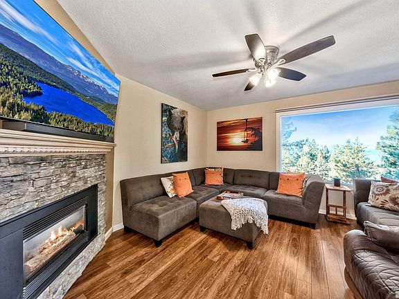 Professional pics in asap. GREAT lake views from this Lake Village unit w/ 4 bedroom, 4.5 bath, including a unit with separate entrance. Three bedrooms are en-suite, two with lake views. Granite kitchen counters, stainless steel appliances, walk-in pantry, opening to living room w/ gas log fireplace & deck for bar-b-ques. The upstairs master, has double sinks, custom tile shower, walk-in closet, overlooking the rooftop deck w/ hot tub & great lake views. The lower level is accessed from entry level, or it's own separate outdoor entrance, featuring a full bath with custom tile shower, mini-kitchen, bedroom, closet, new pine doors and gas log fireplace (rents periodically for $1300 per month). Other features include granite counters in all baths, new windows throughout & new rooftop deck. Walking distance to the HOA pool, rec-room, tennis & pickleball courts. Only a couple minutes to Roundhill Shopping Center, and all the action in the casino corridor. This fully furnished unit is priced to sell.