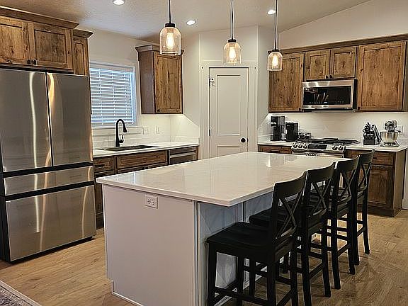 Kitchen features a extra large white island, knotty alder cabinets with crown molding, soft-close doors and drawers, a spacious spice drawer, a walk-in corner pantry, and undercabinet lighting built in.