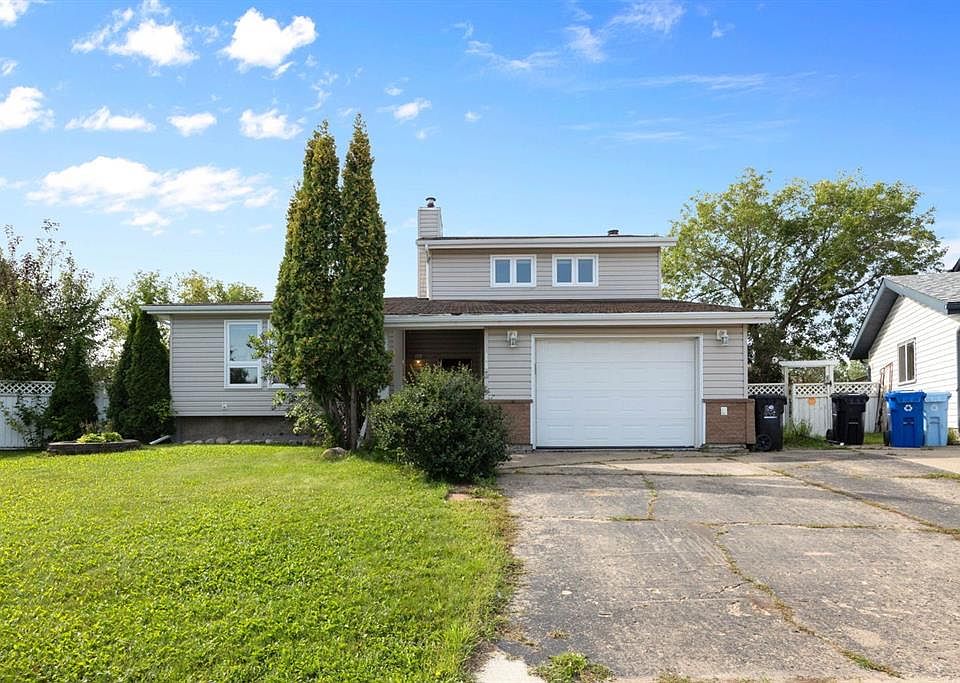 Perfectly situated on a corner lot in an established neighbourhood in Thickwood, this charming fully developed home offers 1,555 square feet of living space, ideal for a growing family. Nestled in a family friendly, quiet cul-de-sac, this family home provides both comfort and convenience. You'll be welcomed by a cozy and spacious living room adorned with big vinyl windows that floods the space with natural light. The spacious kitchen features ample cabinetry, generous counter space, stainless steel appliances and an eatup island that overlooks the dining area and provides direct access to the two tiered deck in the backyard. Upstairs, discover a master bedroom (complete with full ensuite) and two additional bedrooms that share a full bathroom. The family room, complete with a wood-burning fireplace, offers a warm retreat during the winter months. From here, step out into the large backyard that is surrounded by mature trees, providing both privacy and enough space for a trampoline, pool, play set or all of the above! An additional bedroom, full bathroom, laundry room and ample storage in the functional crawlspace completes the basement. There is no shortage of parking space between the double attached garage and elongated driveway, suitable for RV parking. This fully developed family home is ideally located close to schools, parks, and just down the street from walking trails, making it a perfect choice for those seeking privacy and convenience. Call to book your viewing today!