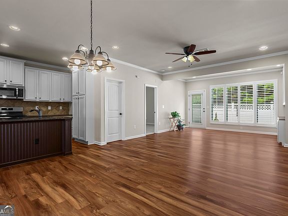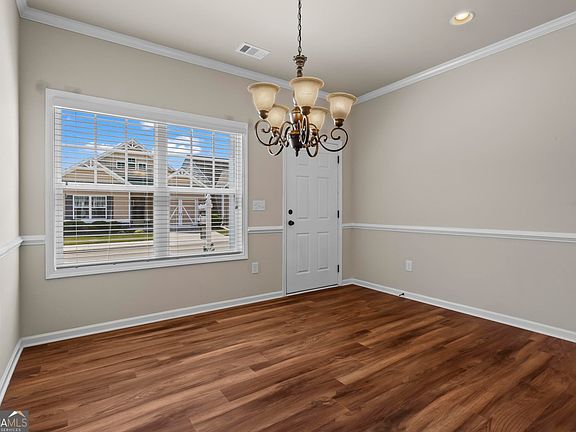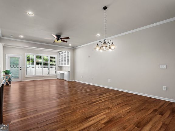 Welcome to the very best of The Villages at River Pointe-one of the area's most sought-after 55+ active adult communities! This beautifully maintained home blends comfort, style, and convenience. Step inside to an inviting open-concept design with gleaming hardwood floors throughout the main living area. A light-filled sunroom-style nook with custom built-ins is the perfect spot for morning coffee, overlooking the professionally landscaped patio, fully fenced backyard, and peaceful views. The chef's kitchen features timeless white cabinetry, granite countertops, recessed lighting, and a spacious island-all open to the living and dining areas for effortless entertaining and everyday ease. The main-level owner's suite is a true retreat with a tray ceiling, spa-like ensuite bath with walk-in shower, dual granite vanities, and generous walk-in and linen closets. Upstairs, two spacious bedrooms and a full bath offer flexible space for guests, an office, or hobbies. Beyond the home, you'll love the vibrant lifestyle The Villages at River Pointe offers-an active clubhouse, planned social events, and easy access to shopping, dining, and North Georgia's best attractions. Enjoy low-maintenance living in a welcoming community designed for connection, relaxation, and fun!