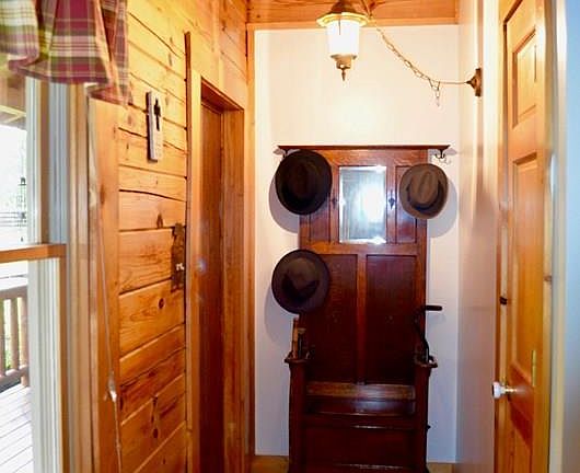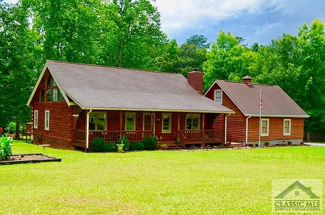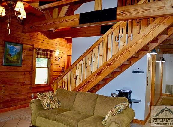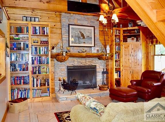 Rustic style close to everything - this home is not to be missed. Feast your eyes on this beautiful log cabin sitting on a gated private 2+ acre lot. Inside, you will marvel at the high ceilings, exposed beams, and woodwork. The home is very airy thanks to the open floor plan with large viewing windows throughout. This floor plan is easy to live in thanks to all the bedrooms being on the main level with a loft above. The home has tile throughout the downstairs except for the relaxing sunroom which has hardwood floors. Outside there is a storage building, a workshop, and a barn ready to accommodate all your supplies. For exterior recreation, you can rest in the gazebo and listen to the water landscape feature, make s'mores over the fire pit, play horseshoes, or get up to your elbows in the garden dirt. This home is a little piece of country heaven located close to it all.