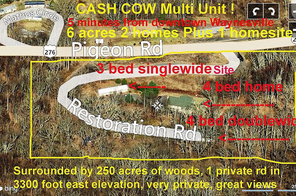 180 Restoration Rd and 145 Restoration Rd. Waynesville NC. 100% Occupancy! CASH COW Investment Property. 9 Cap 4/2 House rented for $1,650 per month, 2000 square foot 3/2 just remodeled modular rented for $1,650 per month. New texture, paint, cabinets, fixtures, vanities, vinyl plank flooring....all new! CLICK ON YOU TUBE link for video walk through. https://youtu.be/_r1Q5bXZMZ8 EXPANSION OPPORTUNITY,... A "ready to go" house-site for a replacement building. Water, septic, power all in. Taxes and insurance are low. $40,000 per year puts this property at close to a 9 cap rate. Add another unit and increase income!