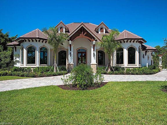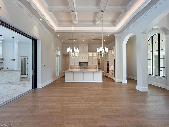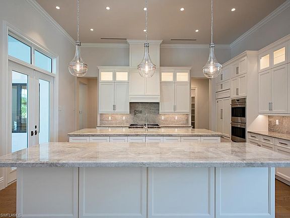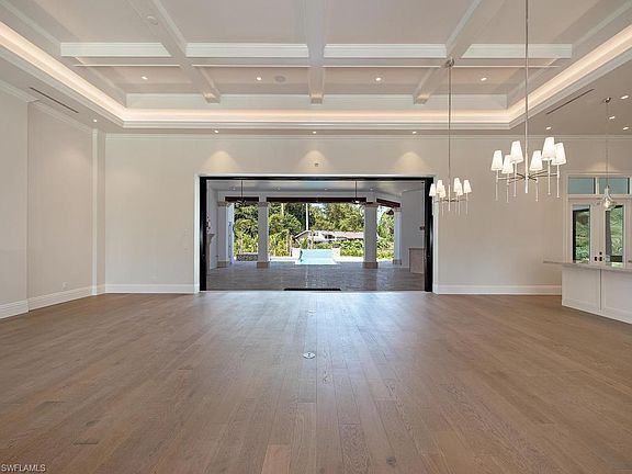Gorgeous Pine Ridge custom estate just completed. Expansive open floor plan with 5-bedrooms, 5 1/2-baths - all on one level. Featuring timeless classic architecture and exquisite designer finishes throughout. Fully-fenced, double-gated entrance and circular drive with motor court are flanked by two separate 2-car garages making an impressive approach. Light and bright great room with 14' coffered ceilings and intricate trim work is open to large dining space and stunning kitchen. Custom solid wood cabinetry, double island, gas Wolf range, Sub-Zero refrigeration, wine cooler, walk-in pantry, and more. European white oak flooring throughout with designer tile in bathrooms. Master suite with luxurious soaking tub, walk-through shower, double vanities, separate makeup vanity, and dual walk-in closets. Four guest suites all with en-suite baths and custom closets outfitted throughout. Hurricane-impact glass throughout, including automatic, full pocket, sliding doors that lead to expansive outdoor living area with retractable screens, gas fireplace, outdoor kitchen with built-in grill, gas fire pit, plus outdoor bath. Stunning pool with spa framed by gas fire bowls and water feature.