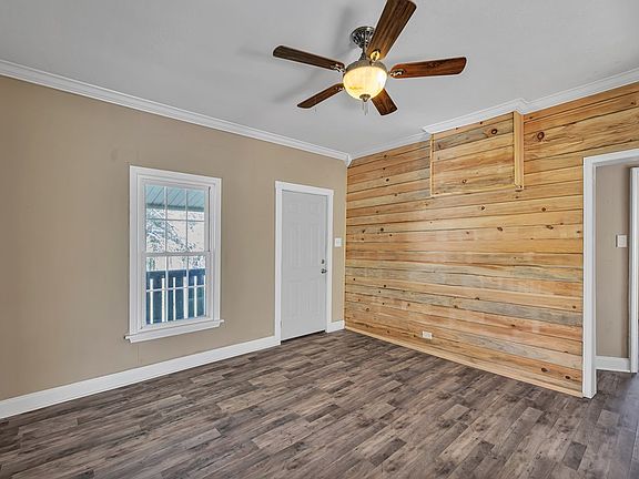 Cozy fireplaceCovered front porchSpacious backyardStunning pine accent wallExpansive covered front porchElegant wainscoting