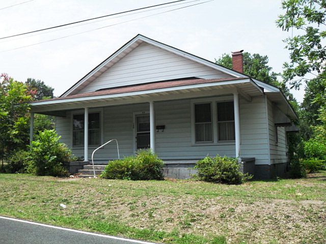 Older frame home with aluminum siding, covered front porch, 2 outbuildings.