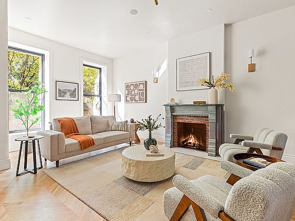 Spanning over 4,000 square feet, this extraordinary home features six bedrooms, five full bathrooms, and one half bath across two residences. The moment you step inside, you’re greeted by a beautifully restored parlor level where an original newel post sets a graceful tone, complemented by soaring 10’4” ceilings and natural light that fills the grand open living space. At its center, a stunning wood-burning fireplace framed by a marble mantel creates a warm and sophisticated focal point.