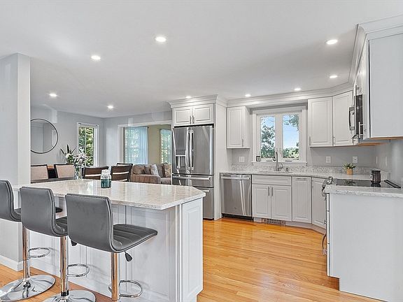 Family roomUpdated white kitchenFinished family roomGreat islandQuartz countertops
