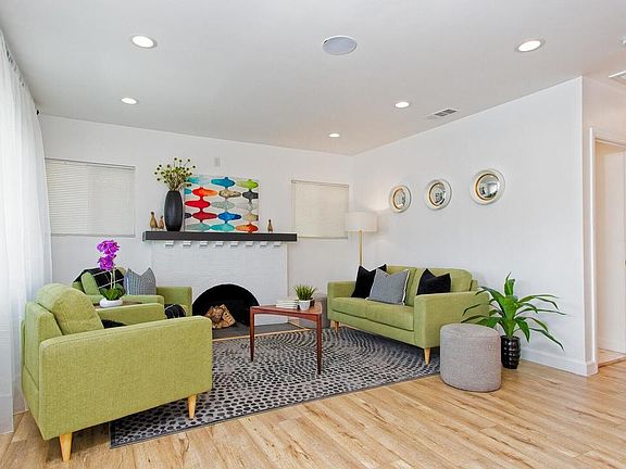 REIMAGINED Craftsman inspired California Bungalow c.1911 with a Modern Vintage Danish flair. Upon entry, you will be greeted with an intimate living room that boasts high ceilings, recess lighting, wide plank barn style floor, and decorative brick fireplace. Open concept floorplan features an extra large formal dining area that leads into kitchen with quartz countertops, stainless steel appliances, shaker style cabinets, subway tile backsplash, and walk in pantry. Enjoy your Holiday parties with in-ceiling bluetooth speakers! Center hallway leads into all 3 extremely spacious bedrooms for complete privacy. Private Master Bedroom has a beautiful en-suite bathroom with a walk in shower and custom glass doors. Plenty of off-street parking with driveway and beautifully water resistant landscaped front yard and spacious backyard . Brand new HVAC w/ Smart Thermostat and Security Cameras for complete comfort.