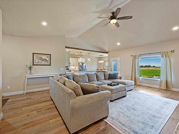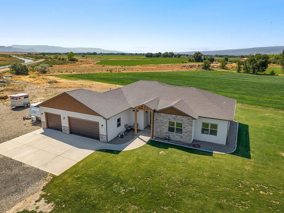Welcome to your dream home nestled in the picturesque beauty of Fruita, Colorado. This stunning 4-bedroom, 2 ½-bathroom residence offers an expansive open living space, a 3-car garage, and breathtaking views of the Colorado National Monument, Grand Mesa, Mt. Garfield, and the Bookcliffs. Situated on 5.21 acres at the end of 20 Road, this property offers abundant tranquility. As you step inside, you'll be greeted by a beautiful living area with vaulted ceilings, large windows, and luxurious LVP flooring. The kitchen is a chef's delight, featuring stainless steel appliances, granite countertops, a wine/drink fridge, dry bar, breakfast counter, exposed beam details, a huge walk-in pantry, and modern lighting. It seamlessly flows into the dining area, offering captivating views of the back yard and surrounding mountains. The split floor plan ensures privacy, with the primary bedroom boasting a spacious layout, a 5-piece en suite bath complete with a beautiful soaking tub, and a large walk-in closet. On the opposite side of the home, you'll find three generously sized bedrooms that share a full, 4-piece bathroom. Additionally, a convenient half bath is located near the living area for guests. The large 3-car garage provides ample space for parking and projects, while the back yard invites you to relax on the covered or uncovered patio spaces and soak in the awe-inspiring views. A designated play area offers fun for all ages. There is also a large shed, chicken coop, young trees, a lush lawn, and plenty of room for additional parking, buildings, or expanding and designing the yard of your dreams. You'll appreciate the rural Colorado atmosphere that surrounds this property, with the back half of the land currently leased for agricultural use and a canal running along the north side. This idyllic setting is only a short drive away from downtown Fruita, providing easy access to a wide array of amenities and activities. Don't miss out on this opportunity to own a remarkable home that combines exquisite living spaces, breathtaking views, and the perfect blend of rural serenity and urban convenience. Schedule a showing today and envision yourself embracing the natural beauty and luxurious comfort that this property offers.