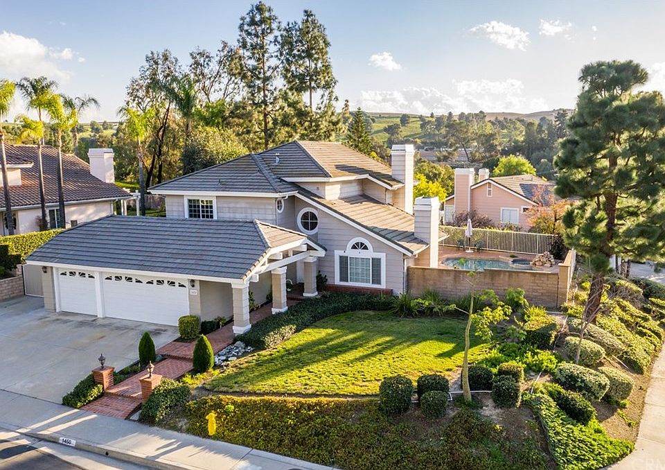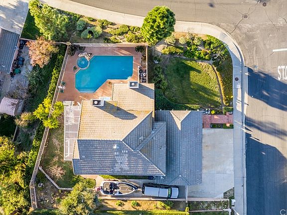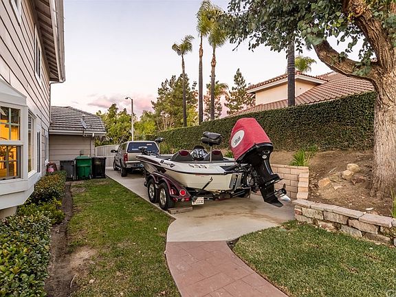 BEAUTIFULLY REMODELED POOL HOME SITUATED ON A CORNER LOT WITH GATED RV PARKING. Front yard landscaping offers a green lawn, brick walkway leading to a covered porch & through double-door entry. The front foyer offers polished travertine floors, vaulted ceilings & opens to the living rm. Living rm w/carpeted floors, fireplace w/travertine surround & wood mantel & a picture window w/plantation shutters overlooking front yard. The formal dining rm has crown molding, chair molding & a window w/shutters. Remodeled kitchen w/cherrywood floors, classic white cabinetry, granite counters, stainless appliances, an island w/professional series cooktop & hood vent, counter top seating, a breakfast nook & is open to the family rm. Family rm offers a floor-to-ceiling brick fireplace, cherrywood floors, a slider to the backyard & ceiling fan. Downstairs offers a bedroom, bathroom & indoor laundry rm. Upstairs, a generously sized master bdrm has a view balcony, vaulted ceilings & a master bath w/dual sinks, custom travertine tile, a tub, separate shower w/glass surround & two walk-in closets. Two additional bdrms upstairs w/an updated full hall bathroom. Backyard features a pool & spa w/rock waterfall, stamped concrete decking, city views, mature trees, a covered patio w/built-in BBQ, refrigerator, sink & countertop seating. A grass area is great for kids or pets & a gated RV parking spot is large enough for an RV or truck attached to a trailer. Three car garage w/direct access to the home.