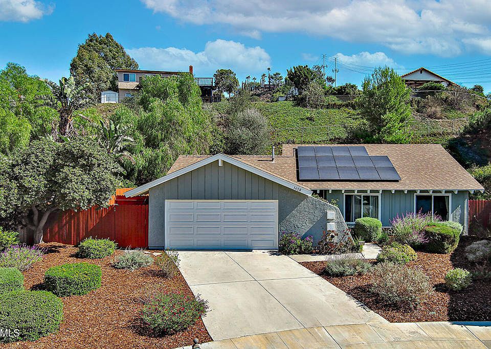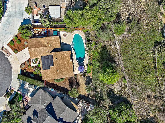 Welcome to this wonderful single story energy efficient home, nestled on a generous size lot at the end of a quiet cul-de-sac! From the attractive curb appeal to the light filled open concept layout, this functional home offers vaulted ceilings, recessed lights, large dual pane windows and sliding glass doors leading to the stunning backyard. The master suite has large sliders with enjoyable views of the outdoors. Two generous size secondary bedrooms complete the interior space. The white color interior and vaulted ceilings give a sense of ampleness making the house feel larger. A fireplace highlights the living room. A new A/C cools down the house and the solar panels ensure comfort and minimal monthly cost on energy bills. The entertainers' backyard showcases a gorgeous pool and spa, green slopes and nature. A little under 2,000 sq ft of flat and usable lot extends beyond the pool and the side of the house, ideal to build a studio ADU, an office, a yoga room, a playground, a greenhouse or just use the land to grow your own vegetables. The possibilities are endless! The lot is private with amenities conducive to enjoy the outdoors and for relaxation. This is one of the few available single story homes with a great floor plan, large lot and outdoor amenities on a quiet cul-de sac. Don't miss this amazing opportunity!! Come see it today!