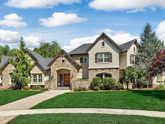 Three fireplacesWorkout roomRock and stucco architectureGated drivewayMedia roomExpansive windowsMature landscaping