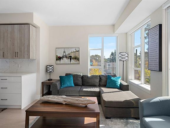 Welcome to The Glenn—a stunning, like-new 2 bedroom, 2 bath corner unit condo located in one of the most convenient and walkable areas of View Royal. Built in 2021 and still under the developer’s warranty, this gorgeous, sun-filled unit features 9’ ceilings, roller shades and NuHeat flooring and both bedrooms have attached baths. The open-concept layout offers seamless flow and modern style, and the unit can even be sold fully furnished—just move right in! Enjoy exceptional building amenities including: Spacious common patio with ample seating and water views, electric vehicle charging in the secure underground parking, bike & kayak storage, plus bike/dog washing station & separate storage. Step outside and you're just minutes from groceries, restaurants, shopping, the E&N Rail Trail, Portage Park, and the scenic Gorge Waterway. Pet lovers will appreciate the strata’s generous policy: 2 pets allowed with no size restrictions.