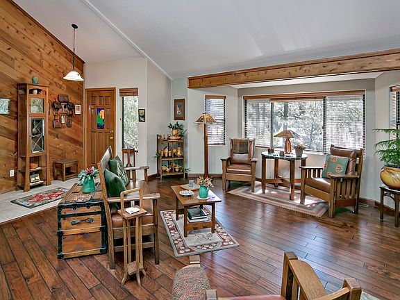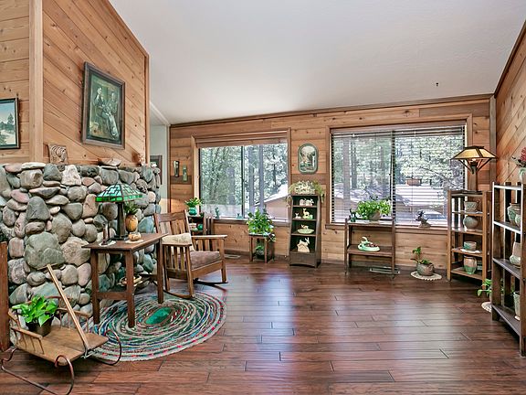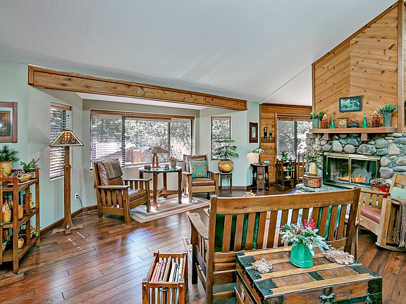 Meticulously maintained home nestled under the Ponderosa Pines. Home is all one level with no interior stairs. Backyard is an easy maintenance garden retreat. Beautiful hardwood floors throughout, newer kitchen cabinetry, upgraded bathrooms and granite counter tops. New gas pack in 2017. Enjoy the trees and lush landscape from the oversized windows, skylights and cozy up to the river rock wood fireplace. Designer features run through out this amazing spotless home. The bonus sunroom is perfect for sipping wine, enjoying your morning coffee or just relaxing and taking it all in. This home is stunning. Great full time residence or seasonal getaway.