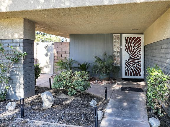 Wonderful light and bright single level condo located in the popular gated Sunrise Palms community. Unit has an attached garage with a large wrap around gated patio with magnificent west facing mountain views and large entertainment areas. Enjoy the kitchen with concrete counters, colored tiled back splash and stainless appliances plus the updated red tiled bathroom. Living room offers patio access via wood framed sliding door. There are also multiple solar tubes providing great light throughout the unit. The primary bedroom has a large walk-in closet and an additional slider to the patio area. Close proximity to one of the many pools, spas, basketball, pickle ball and tennis courts. The HOA dues include water, trash and common areas upkeep. Enjoy the Palm Springs lifestyle while living in this wonderful condo. Deadline for offers is at 3pm Saturday November 6th.