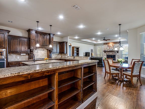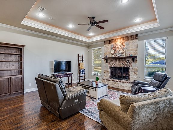 Welcome to your private retreat in the prestigious gated community of Forest Hills. Nestled on a serene cul-de-sac, this 1.049-acre property offers unmatched privacy and convenience—just minutes from Denton, Little Elm, and Frisco, and only 40 minutes to DFW Airport. This beautifully maintained home features an open layout with oak wood floors throughout, a spacious living room with a stone gas fireplace, and a gourmet kitchen equipped with stainless steel appliances, granite countertops, island with second sink, and walk-in pantry. The primary suite boasts dual vanities, a walk-in shower, and a generous closet. Secondary bedrooms share a Jack & Jill bath, and a dedicated office provides flexible space for work. Step outside to your personal oasis: a custom pool and spa with tanning ledge and waterfall, surrounded by forest views. The expansive covered patio includes a double-sided stone fireplace, built-in grill, rain shower feature, radiant heat lamps, and electric screens—perfect for year-round entertaining. Recent upgrades (2022–2025) include two new HVAC systems, PebbleTec pool resurfacing and modernization, foundation piers, new pool motor, irrigation system, and whole-home repaint. A rare blend of comfort, quality, and style in a premier location close to Lake Lewisville and Lake Ray Roberts.