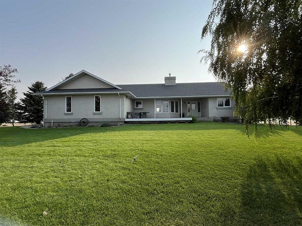 So here is an amazing acreage that has all the bells and whistles, and is truly a "Move In" ready home. Sitting on 7.07 acres, the home is 1633 SQFt, 4 bed, 4 bath, with tons of natural light and open floorplan that includes a large kitchen, island, dining room, and a beautiful deck off the kitchen to enjoy those beautiful sunsets. Living room boasts a fireplace for the fall evenings coming soon, main floor laundry, and another two bedrooms. The basement has a huge rec room complete with a walk-out basement to enjoy ! So many upgrades to talk about with this one. There are large windows downstairs so you don't have that "basement" feel to it, another two large bedrooms, large bathroom, cold storage and another large storage room. Attached 25x25 garage with radiant heat that's a year old, AC, UG sprinklers , 12x16 metal Garden shed with a roll up door and a concrete pad, a treed park-like yard that many dream of. Everything has been so well taken care of, including the newly built 40x60 shop. Concrete floor with a drain, plumbed and ready to go for a bathroom in there if you would want, gas line, set up for an up-top exhaust fan, and 20x14 door. The yard, the home, the views, the shop and the animals... It's all here for you ~
