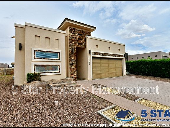 Step inside sophistication. This single-story home in East El Paso merges rich design with smart functionality. A sleek stone-accented exterior leads to an airy interior featuring wood-look tile flooring and elegant coffered ceilings. The open-concept living room boasts a built-in fireplace, recessed lighting, and seamless flow into a gourmet kitchen with granite countertops, a mosaic tile backsplash, stainless steel appliances, and espresso cabinetry. The primary bath offers a spa-inspired walk-in shower with dual showerheads and vessel sinks. Outdoors, enjoy a landscaped backyard retreat with a fire pit, decorative privacy wall, and covered patio. Located just minutes from the Eastlake Marketplace and Horizon Golf Course, this home blends privacy and access with striking architectural elements. Deposit-Free Renting service to Obligo qualified renters, fees may apply.
