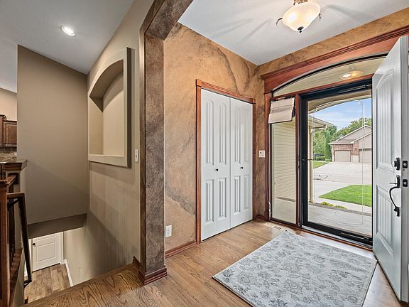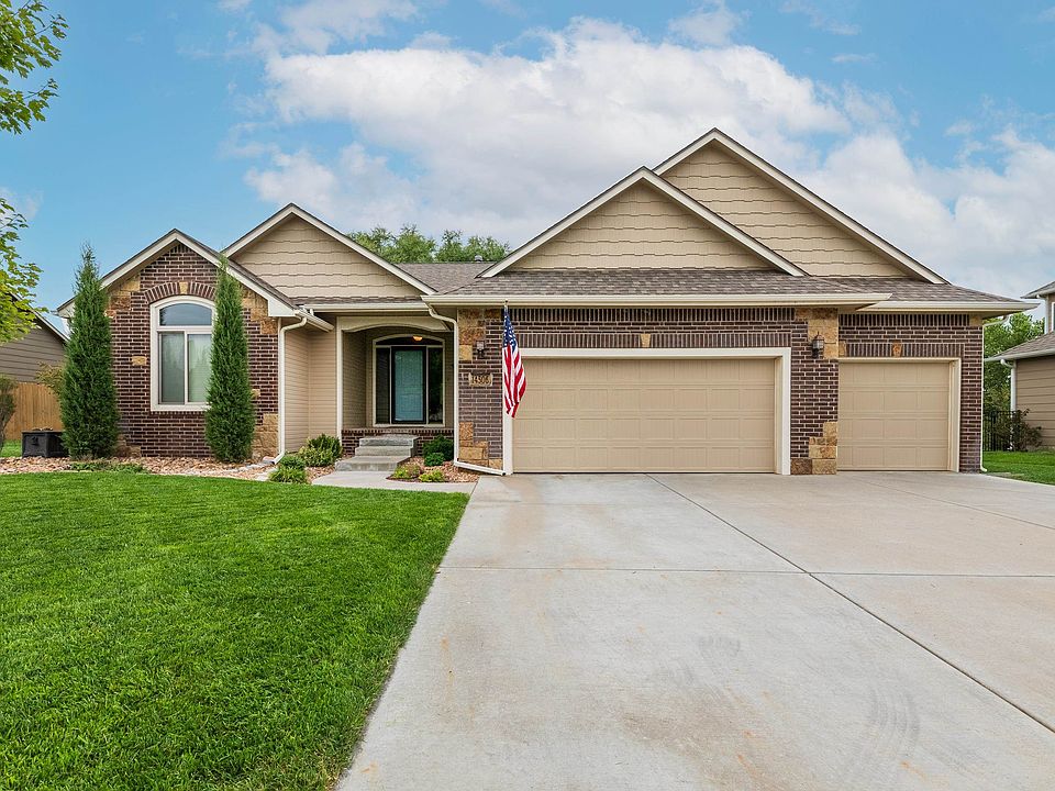 Well built, former Model Home, with NO SPECIALS, boasts open floor plan with a beautiful, large, granite island, knotty alder cabinets, stone backsplash, gas stove, walk in pantry, hardwood floors and a drop zone, off of the garage. In the living room you'll find a gas fireplace. The laundry is separate with a built-in folding table. The master bedroom features an en suite bath, with dual vanities, garden tub, separate shower, and a seasonal master closet. The view out basement has a spacious family/rec. room with LVP flooring and a beautiful wet bar with a granite countertop. You'll also find a spacious basement bedroom, (13.1 x 12.1), a bonus room/office with a closet, and a beautiful bathroom. Also, a large storage room, plus a smaller one. The home is located on a cul-de-sac with quick access to Kellogg, in the popular Goddard School District and several pools in the neighborhood for your use. You can access the covered deck from the dining room or from the primary bedroom. The back yard is on the north side of the house and is fenced on 3 sides, with a tree row lining the backyard. This information is deemed reliable but not guaranteed.