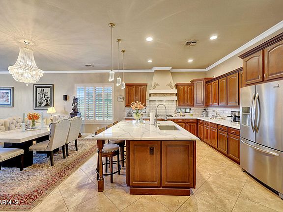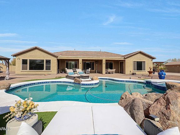Top Tier Tastefully updated 4,255sf single-story home on 1 acre parcel within the private gated community of Copper Canyon Ranch. Upon arrival you will notice the mature landscaping, impressive fountains, convenient circular driveway and inviting courtyard w/misters. As you enter through custom metal double entry doors the high ceilings w/crown molding throughout, expansive floor plan and tile flooring will draw you in. Kitchen is a chef's delight boasting quartz countertops, oversized island w/breakfast bar, gas cooktop, tile backsplash, pendant lighting and walk-in pantry. Master suite features direct patio access, 2 bathroom quartz top vanities, tile shower w/glass enclosure, soaking tub, privacy room, travertine floor tile and oversized walk-in closet. Other interior features... include 3 guest bedrooms, 2 guest bathrooms, bonus room with wet bar, office/den, hall study, bedroom lighting with fans, gas fireplace, arched interior doors, window shutters, laundry room sink and laundry room cabinets. Mediterranean style backyard designed for entertainment and relaxation. Newly resurfaced PebbleTec heated pool and spa is surrounded by unique mister system that is at both patio/pool levels featuring multi color led lighting with waterfall. Multiple backyard seating areas at patio, under gazebo or around natural gas fire pit. Side yard has multi-use sportscourt, golf cart garage/storage and outdoor grill area with sink. Additional home features include 3 car garage, garage mini-split hvac system, garage cabinets, water softener, RV gate, Rv parking and north/south exposure. Welcome Home!