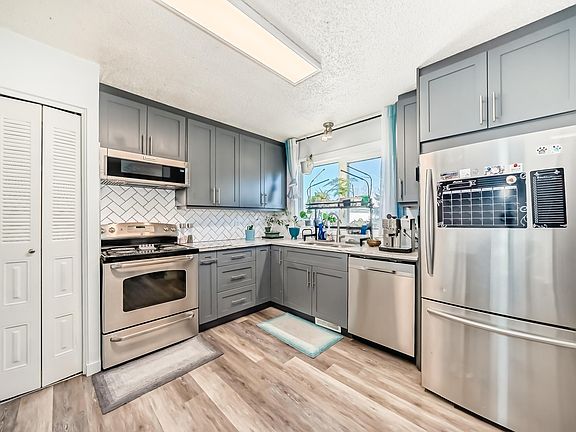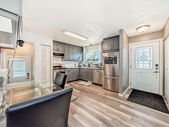 Quiet residential streetVinyl plank flooringNice sized kitchenStainless steel appliancesTile backsplashGrey custom cabinetsMassive rec room