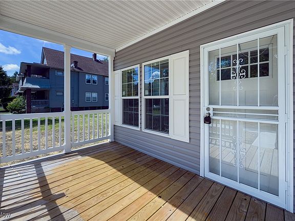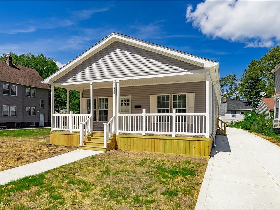 Welcome to this remarkable custom built modular home in North Collinwood! This ranch style home offers one floor living with three bedrooms, two full baths and a full basement. This home is built to Cleveland Green Building Standards and is highly energy efficient! The charming front porch leads to the inviting open floor plan. Light and bright with neutral decor, the comfortable great room has soft wall to wall carpeting, a ceiling fan and recessed lighting. The adjoining kitchen has plenty of gleaming white cabinetry, stainless steel Whirlpool appliances including a refrigerator, dishwasher, gas range, microwave, a casual eating area and breakfast bar perfect for family gatherings. The laundry room is nearby complete with a washer and dryer, a coat closet and side door entry from the new concrete driveway. Three bedrooms include the primary suite with wall to wall carpeting, two walk-in closets and private bath with dual vanities and step-in shower. Two additional bedrooms have soft carpeting, generous closet space and share the hall bathroom with a tub and shower combination. All bedrooms have ceiling fans. The unfinished lower level expands the entire footprint of the house and is ready for future expansion as it is plumbed for a full bath! Outside, the grass is planted and a new concrete driveway leads to the two car garage. Take advantage of the 15 year tax abatement!! Ask about buying WITH NO MONEY DOWN!
